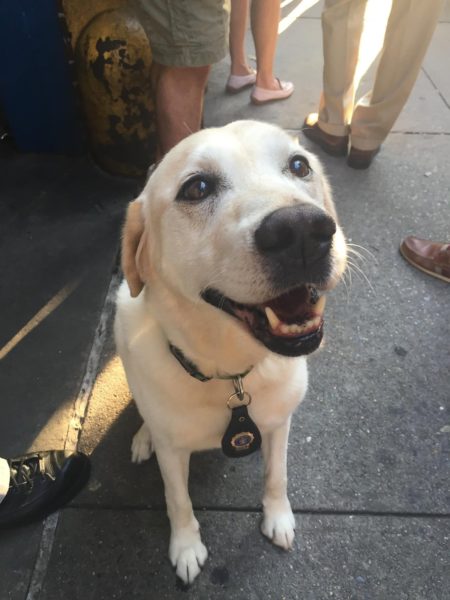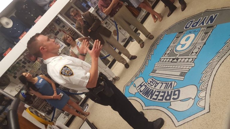 Getting down to business: Members of the Greenwich Village-Chelsea Chamber of Commerce recently toured the Sixth Police Precinct’s stationhouse on W. 10th St. and also the adjoining Bomb Squad headquarters on Charles St. The Bomb Squad’s super-sniffing dog was happy to say hi to the local business leaders, as were members of the precinct’s detectives squad. The chamber also recently toured the East Village’s Ninth Precinct stationhouse.
